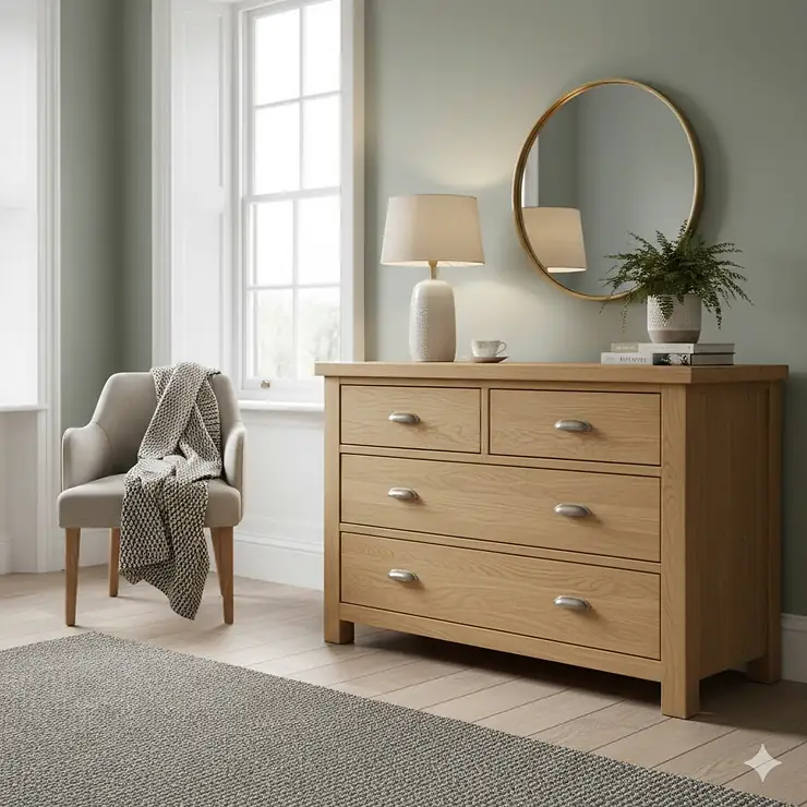 Oak’s natural warmth complements Scandi-minimalist aesthetics popular in British homes, particularly when paired with white walls, natural textiles, and green plants. In traditional settings, oak chest of drawers anchor rooms beautifully alongside brass fixtures, Persian rugs, and heritage paint colours.