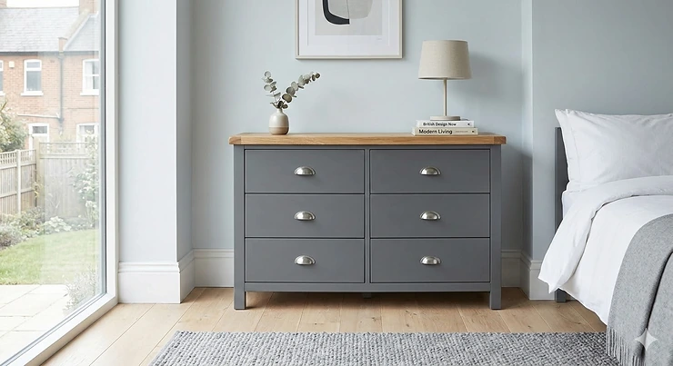 The Hartley Wide 6-Drawer Chest represents painted wood furniture at its finest. Featuring a soft grey finish with a chunky overhanging oak top (£280-£320), this Furniture Village exclusive combines superb craftsmanship with timeless design.